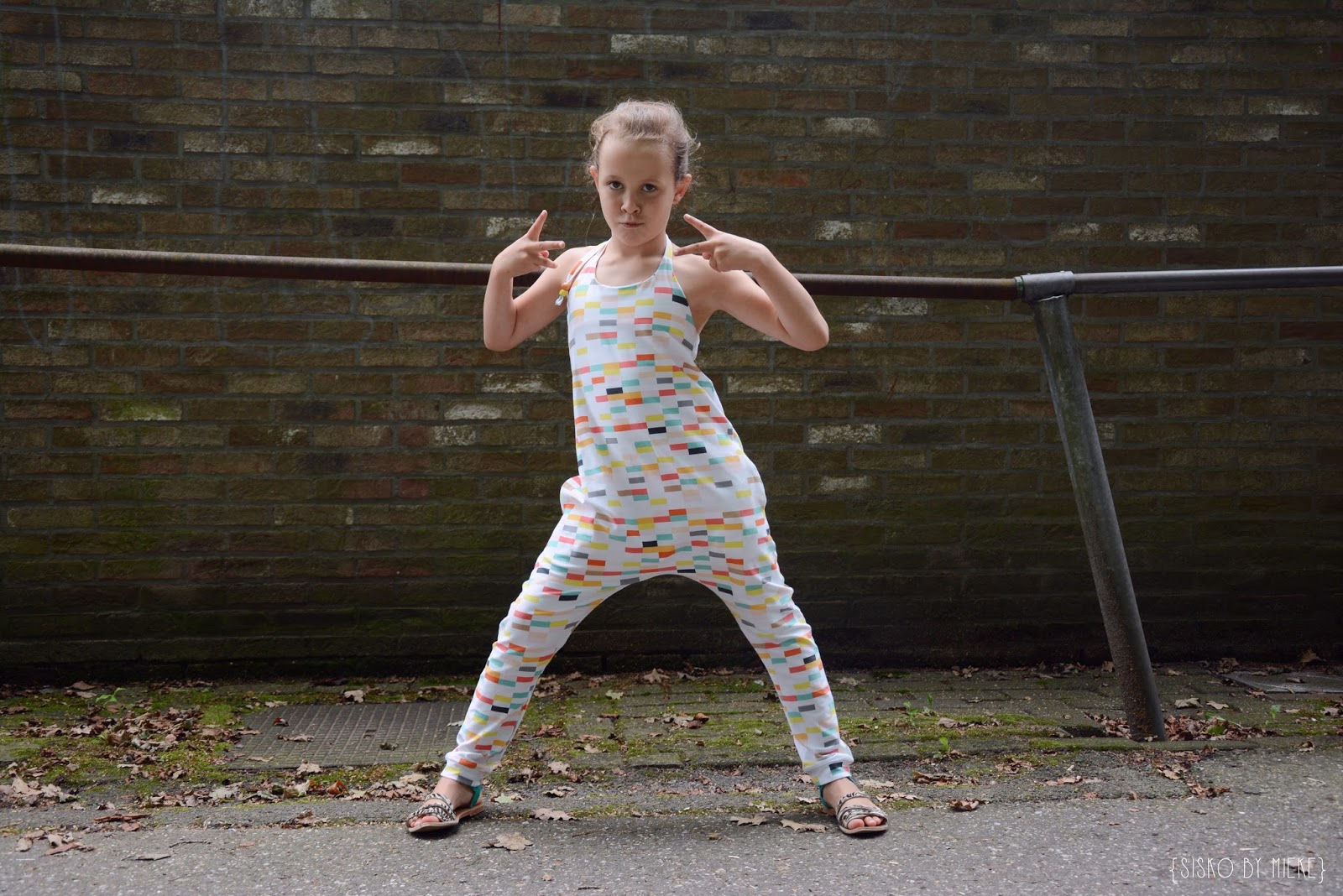 Jolien is tegenwoordig helemaal into jumpsuits. Ze spreekt het woord liefkozend - en niet beter wetend - uit als 'shjumpies' of 'shjumpshoets'. Vooral de exemplaren waarin ze zich vrijelijk kan bewegen dragen haar voorkeur weg. Het nieuwe Hoppe-patroon van StraightGrain en 128 is dus op haar lijf geschreven.