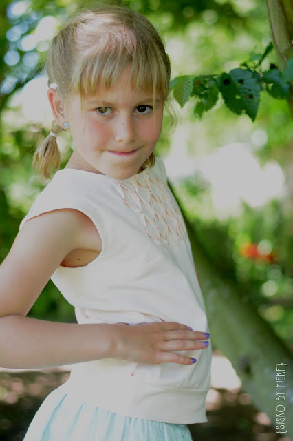 Ik nam een lapje stof van 110cm breed, werkte bovenaan af met elastische biais en smockte dan een rij of 5 over de ganse breedte. Bij het ochtendgloren wikkelde ik de lap rond Jolien haar bovenlijf en bleek dat als bij wonder de perfecte afmeting (voor de geïnteresseerden, Jolien haar borstomtrek is ongeveer 64cm). Ik stikte een zijnaad, rolzoomde het topje op 5 minuten en nam dan een (gedubbeld) stuk biais voor de lintjes.Vooraan naaide ik deze gewoon aan de rand vast, maar achteraan wilde ik iets speciaal.